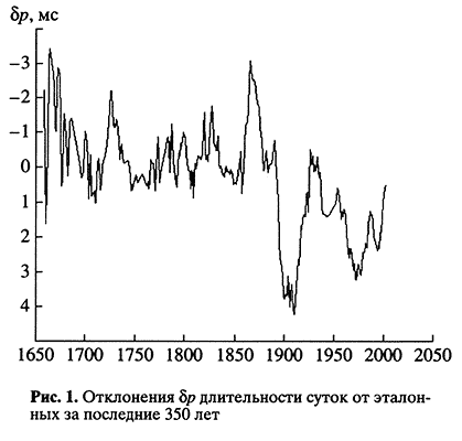 Скорость вращения Земли можно охарактеризовать отклонением длительности земных суток от эталонных, равных 86400 с. Чем короче земные сутки, тем быстрее вращается Земля. До создания очень точных атомных часов скорость вращения контролировалась благодаря сравнению наблюденных и вычисленных (в соответствии с небесно-механическими теориями) координат планет. Так удалось получить представление об изменении скорости вращения Земли в течение последних трех столетий (рис. 1). С начала XVIII до середины XIX в. скорость вращения Земли менялась мало. Со второй половины XIX в. по настоящее время наблюдаются значительные нерегулярные флуктуации угловой скорости вращения с характерными временами порядка 60-70 лет. Быстрее всего Земля вращалась в 1870 г., когда длительность суток была на 0.003 с короче эталонных, а медленнее всего - в 1903 г. (земные сутки были длиннее эталонных на 0.004 с). С 1903 по 1934 г. происходило ускорение вращения Земли, с конца 30-х годов до 1972 г. наблюдалось замедление, а с 1973 г. по настоящее время Земля ускоряет свое вращение. Колебание угловой скорости вращения Земли, наблюдавшееся в XX в. (с 1903 по 1972 г.) часто называют 60-70-летним. В XIX в. колебание примерно того же периода было зафиксировано с 1845 по 1903 г. В более раннюю эпоху 60-70-летние колебания не прослеживаются. К сожалению, данные XVII-XVIII вв. имеют низкую разрешающую способность, так как тогда интервалы времени между наблюдениями иногда достигали 29 лет.