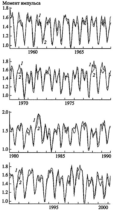 Момент импульса - это физическая величина, которая не может возникать или уничтожаться. Она способна лишь перераспределяться. В рассматриваемом случае перераспределение происходит между атмосферой и Землей. Когда момент импульса атмосферы увеличивается, то есть усиливаются западные ветры или ослабевают восточные ветры, момент импульса Земли уменьшается, то есть замедляется ее вращение. Когда же момент импульса атмосферы уменьшается (ослабевают западные или усиливаются восточные ветры), вращение Земли ускоряется. Степень согласия изменений момента импульса атмосферы и момента импульса Земли в 1958-2001 гг. показан на рисунке 6. Величины отклонений момента импульса Земли взяты с обратным знаком. Видно, что ход обеих кривых совпадает в пределах ошибок наблюдений. Так что суммарный момент импульса планеты и атмосферы остается неизменным.