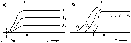 Рис. 1. Зависимость фототока от интенсивности света: а) при постоянной его частоте; б) при разной частоте