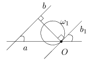 Докажем сначала, что для любых прямых угол a,b совпадает с углом между inv>O>R(a) и inv>O>R(b). Утверждение очевидно, если прямые проходят через точку O. Пусть теперь O a и O b (рис. 6). Обозначим через >1> окружность, в которую переходит прямая b, и через b>1> - касательную к >1> в точке O. Так прямые b и b>1> перпендикулярны одному и тому же диаметру, то они параллельны. Поэтому угол между a и >1>, равный по определению углу между a и b>1>, совпадает с углом a,b. Рассуждения аналогичны и в случае, когда O ab (надо рассмотреть касательные к окружностям inv>O>R(a) и inv>O>R(b) в точке O).