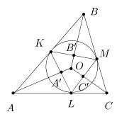 Доказательство. Точки касания вписанной окружности (O,r) со сторонами [AB], [AC] и [BC] обозначим соответственно через K, L и M (рис. 11).