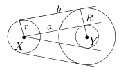 Решение F. Для решения этой задачи достаточно уметь проводить общую касательную к двум произвольным окружностям (X,r) и (Y,R). Будем считать, что r < R. Проведем из точки X касательную a к окружности >1>(Y,R-r) (рис. 10), тогда искомая внешняя касательная b к окружностям и будет параллельна прямой a и находится от нее на расстоянии r.