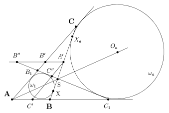 inv>O>R(>э>) = (BC) = (B>1>C>1>) и >э> касается inv>O>R(>1>) = >1> и inv>O>R(>a>) = >a>. Аналогично доказывается, что >э> касается оставшихся двух вневписанных окружностей. Теорема доказана.
