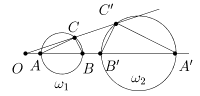 Доказательство. На прямой (AB) можно легко найти две точки O и C, принадлежащие множеству (одна из них будет внутренней точкой отрезка [AB], другая - внешней точкой этого отрезка). Рассмотрим инверсию относительно окружности с центром в точке O произвольного радиуса R. Для образов точек A, B и C имеем
