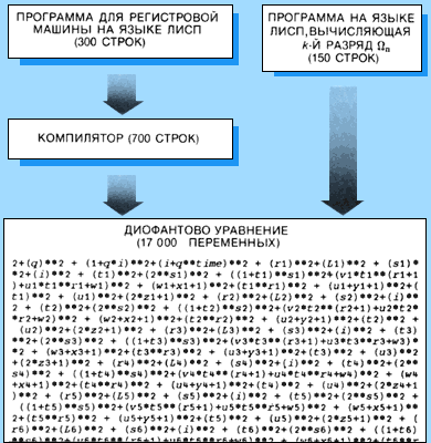 Подав на вход реального компьютера, имеющего программу-компилятор, программу регистровой машины, которая выполняет инструкции на языке Лисп, получим через несколько минут на выходе уравнение длиной около 200 страниц, содержащее примерно 17000 неотрицательных целых переменных. Итак, я могу вывести диофантово уравнение с параметром k, кодирующее k-й разряд Ω>n>, путём простой подстановки программы на Лиспе (в двоичной форме), предназначенной для вычисления k-го разряда Ω>n>, в 200-страничное уравнение. Для любой заданной пары значений k и n диофантово уравнение имеет в точности одно решение, если k-й разряд Ω>n> равен 1, и не имеет решения, если k-й разряд Ω>n> равен 0.