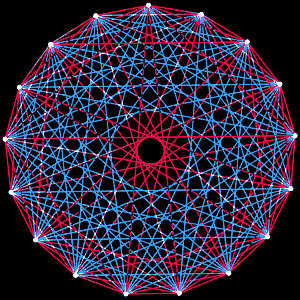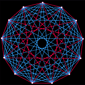 Рис.1. Головоломка о вечеринке представляет собой задачу, типичную для приложений теории Рамсея. Какое количество людей достаточно для того, чтобы образовать группу, в которой всегда окажется либо четверо людей знакомых друг с другом, либо четверо, друг с другом незнакомых? На этом рисунке гости представлены точками. Каждое красное ребро на этом графе соединяет гостей, знакомых друг с другом, а каждое синее — незнакомых. В группе из 17 точек, изображённых на рисунке, невозможно найти четыре точки для которых сеть соединяющих их рёбер была бы целиком красной или целиком синей Поэтому требуется более 17 человек, чтобы среди них обязательно оказалось либо четверо знакомых, либо четверо незнакомых друг с другом. На самом деле во всякой группе из 18 человек всегда найдутся либо четверо знакомых, либо четверо незнакомых друг с другом. |