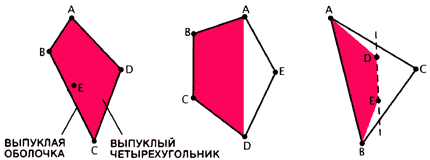 Рис.3. Теория Рамсея была заново открыта в 1933году, когда молодая студентка Эстер Клейн предложила следующую геометрическую задачу: доказать, что если пять точек расположены на плоскости и никакие три из них не лежат на одной прямой, то какие-нибудь четыре из них всегда образуют выпуклый четырёхугольник. Любая конфигурация, удовлетворяющая условиям задачи, относится к одному из трёх случаев, показанных на рисунке. Простейший случай — тот, когда выпуклая оболочка (т.е. выпуклый многоугольник, охватывающий все точки) есть четырёхугольник. Если выпуклая оболочка является пятиугольником, то любые четыре точки можно соединить так, что они образуют четырёхугольник. Треугольная выпуклая оболочка всегда содержит внутри две точки; здесь — D и E. Линия DE делит треугольник на две части так, что две точки, A и B, лежат по одну сторону от неё. Четыре точки ABCD должны образовывать выпуклый четырёхугольник. |