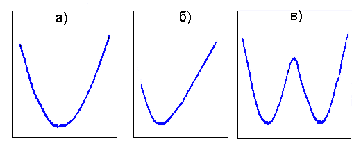 Над новым массивом проведем 2 следующие операции. Во-первых, проведем сортировку массива по возрастанию значений элементов массива. Во-вторых, после сортировки вычислим разности между каждыми 2-мя соседними элементами массива. После этого следует рассмотреть функцию изменения разностей от абсолютного значения A*B. График этой функции F(A*B) будет иметь один или несколько ярко выраженных минимумов. Число этих экстремумов будет соответствовать числу прямых, которые можно провести через экспериментальные точки. Например, рис. а) свидетельствует о том, что массив данных допускает линеаризацию одной прямой. Среднее положение минимума функции F(A*B) относительно интервала рассматриваемых значений A*B свидетельствует о том, что систематических отклонений от прямой линии практически не существует. Рисунок б) говорит о том, что часть точек имеет систематическое отклонение от линейной закономерности, так как минимум функции смещен от середины отрезка значений A*B. На рисунке в) рассмотрен случай, когда экспериментальные данные линеаризуются 2-мя прямым.