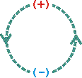 На рисунке условно изображено дискретное поперечное электрическое возмущение (смещение) квантового поля. Знаком (+) обозначена положительная область возмущения, знаком (-) - отрицательная. Между разноименными областями существует электрическое смещение, которое представляет электрический поток величиной в квант количества электричества. Движение (изменение) электрического потока всегда связано с током смещения. Стрелки "/\" и "\/" указывают направление тока электрического смещения квантов поля (квантов заряда). Вначале, образуя возмущение (напряженность), ток электрического смещения поля течет в одну сторону, в конце возмущения - в обратную, т.е. в результате смещения возникает область с избытком в один квант и область с недостатком - дырка, которые, распространяясь как поперечное возмущение, представляют вихревое (нестационарное) электрическое поле. Поперечное возмущение, проходя участки поля в виде расходящихся и затем сходящихся разноименных областей как поперечное противоположное движение зарядов с разными знаками, совершаемое за период в половину длины волны фотона, образует в пространстве движущийся дискретный круговой ток электрического смещения I>см> = 2ev, где e - квант электрического заряда, v - частота электромагнитной волны. Эффективный радиус, по которому течет замкнутый ток смещения: r = /2, где - длина волны фотона. Надо заметить, что отрицательная область возмущения создает обратное направление тока, поэтому ток замкнут по кругу (аналогия с током проводимости, где отрицательно заряженные электроны движутся в одну сторону, но принято считать, что ток течет в обратном направлении). Иногда возмущение удобнее представлять как состоящее из двух разноименных токов смещения - положительного и отрицательного. Движущийся круговой ток смещения для покоящегося наблюдателя является переменным, так как в начале распространяющегося возмущения он течет в одном направлении, в конце - в обратном.