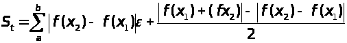 По методам трапеций и средних прямоугольников соответственно интеграл равен сумме площадей прямоугольных трапеций, где основание трапеции какая-либо малая величина (точность), и сумма площадей прямоугольников, где основание прямоугольника какая-либо малая величина (точность), а высота определяется по точке пересечения верхнего основания прямоугольника, которое график функции должен пересекать в середине. Соответственно получаем формулы площадей —