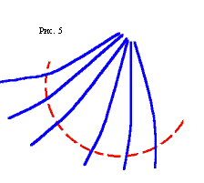 На рис. 4 зображено цікавий варіант розташування трьох прямих на площині Лобачевського: кожні дві із них паралельні, тільки в різних напрямках. А на рис. 5 всі прямі паралельні одна одній в одному напрямку (пучок паралельних прямих). Лінія позначена пунктиром на рис.5 "перпендикулярна" всім проведеним прямим (тобто дотична до цієї лінії в любій її точці М перпендикулярна прямій, яка проходить через М.). Ця лінія називається граничною кола, або орициклом. Прямі розглянутого пучка ніби являються її "радіусами", а центр граничної кола лежить в нескінченності, оскільки "радіуси" паралельні. В той же час гранична кола не являється прямою лінією, вона "викривлена". І інші властивості, які в евклідовій геометрії має пряма, в геометрії Лобачевського виявляються властивими другим лініям. Наприклад, з множини точок, які знаходяться на одній стороні від даної прямої на даній відстані від неї, в геометрії Лобачевського являють собою криву лінію, яка називається єквидистантою.