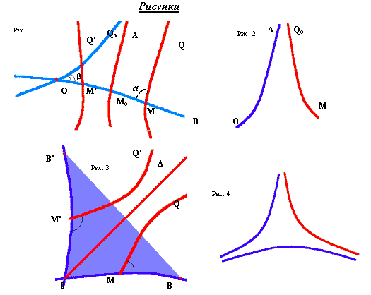 Нехай тепер АОВ – деякий гострий кут. (рис1) В геометрії Лобачевського можна вибрати таку точку М на стороні ОВ, що перпендикуляр MQ до сторони ОВ не перетинається з другою стороною кута. Цей факт як раз підтверджує, що не виконується п'яте правило: сума кутів ( і ( є менше розгорнутого кута, але прямі ОА і MQ не перетинаються. Якщо почати зближувати точку М до О, то найдеться така "критична" точка М0, що перпендикуляр M0Q0 до сторони OB поки що не перетинається зі стороною ОА, але для любої точки М`, яка лежить між О і М0, відповідаючий перпендикуляр М`Q` перетинається зі стороною ОА. Прямі ОА і M0Q0 все більше приближаються одна до одної, але спільних точок не мають. На рис.2 ці прямі зображено окремо; а саме такі необмежено наближаються одна до одної прямі Лобачевський в своїй геометрії називає паралельними. А два перпендикуляра до одної прямої, які необмежено віддаляються один від одного, як на рисунку Лобачевський називає прямими, які розходяться. Виявляється, що цим і обмежуються всі можливості розміщення двох прямих на площині Лобачевського: дві неспівпадаючі прямі, які або перетинаються в одній точці, або паралельні , або можуть бути такими, що розходяться (в цьому випадку вони мають єдиний спільний перпендикуляр)