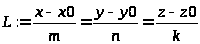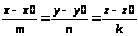 т. М0 имеет коорд. (x0,y0,z0); т. M (x,y,z), напр. в-р S={m,n,k}, тогда ур-е записанное в коорд форме: