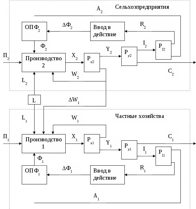 Задачей настоящей работы является разработка модели взаимодействия двух основных подсистем производства продуктов сельского хозяйства в районных АПК, использование которой позволит выработать предложения по методам целенаправленного воздействия на подсистемы для достижения требуемого (желаемого) состояния системы.