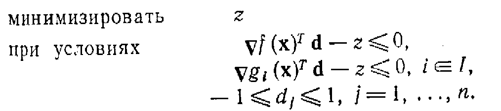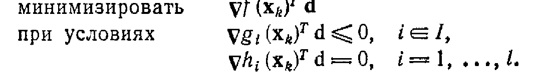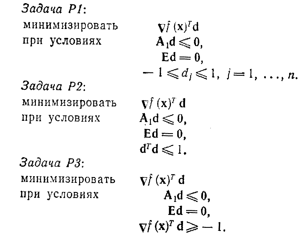 Задачи Р1 и РЗ являются задачами линейного программирования и, следовательно, могут быть решены симплекс-методом. Задача Р2 содержит квадратичное ограничение, но может быть рассмотрена в несколько упрощенном виде. Так как d = 0 является допустимой точкой в каждой из приведенных выше задач и так как значение целевой функции в этой точке равно нулю, то ее оптимальное значение в задачах Р1, Р2 и РЗ не может быть положительным. Если минимальное значение целевой функции в задачах Р1, Р2 или РЗ отрицательно, то по лемме построено возможное направление спуска. С другой стороны, если минимальное значение целевой функции равно нулю, то, как показано ниже, х является точкой Куна — Таккера.