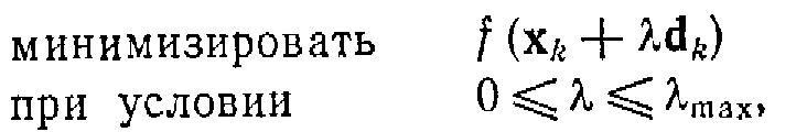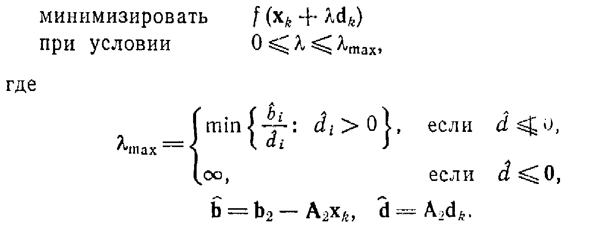 Только что было показано, как строить возможное направление спуска или убедиться, что текущая точка удовлетворяет условиям Куна—Таккера. Пусть теперь х>k> —текущая точка, а d>k>-возможное направление спуска. В качестве следующей точки x>k+1> берется , где длина шага К& определяется из решения следующей задачи одномерной минимизации: