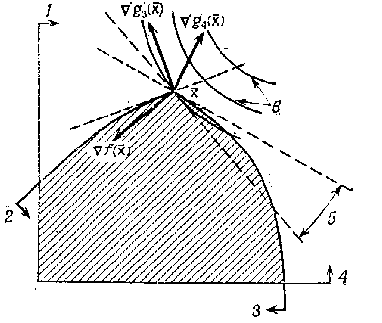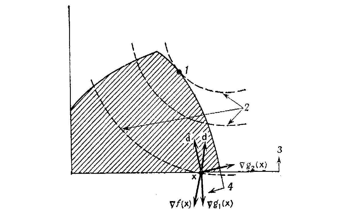 На рис. 1, где начало координат перенесено в точку х, изображена совокупность этих направлений, образующая конус возможных направлений. Заметим, что если сдвинуться на небольшое расстояние от точки х вдоль любого вектора d, удовлетворяющего двум приведенным выше неравенствам, то останемся в допустимой области.