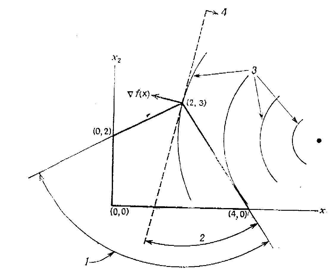 Возьмем х=(2, 3)T и заметим, что первые два ограничении являются активными в этой точке. В частности, матрица А>1> из леммы равна А>1>=[-1>3 > 2>2>]. Следовательно, вектор d является возможным направлением тогда и только тогда, когда А>1>d0, т.е. в том и только в том случае, если