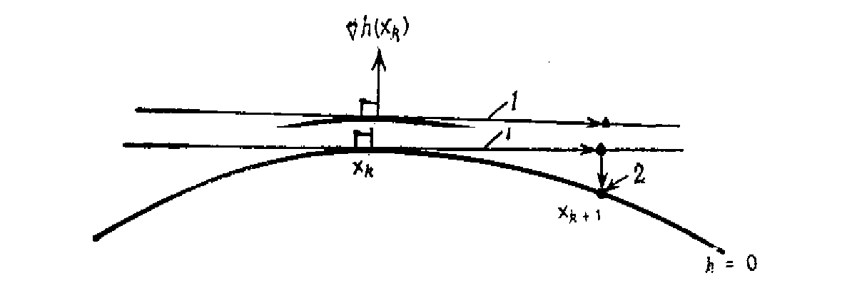 Метод возможных направлений может быть модифицирован на случай, когда имеются нелинейные ограничения-равенства. Для иллюстрации обратимся к рис. 8, который отвечает единственному ограничению-равенству. Для заданной допустимой точки х>k>, в этом случае не существует ненулевого направления d, такого, что при для некоторого положительного . Это затруднение можно преодолеть, если двигаться вдоль касательного направления d>k>, для которого , а затем скорректировать движение и возвратиться в допустимую область.