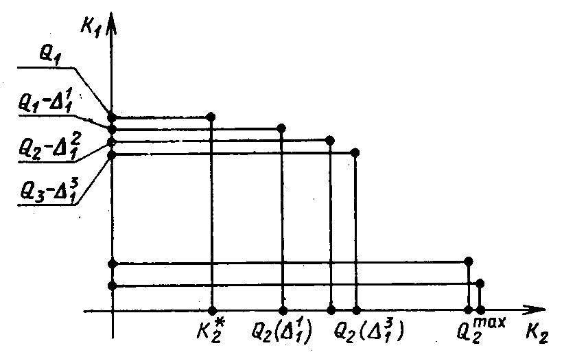 Он показывает, что вначале даже небольшие величины уступок позволяют получить существенный выигрыш по второму критерию; с дальнейшим увеличением уступки выигрыш растет все медленнее. На основе анализа полученных данных и решают вопрос о назначении величины уступки >1>, а затем находят Q>2>(>1>).