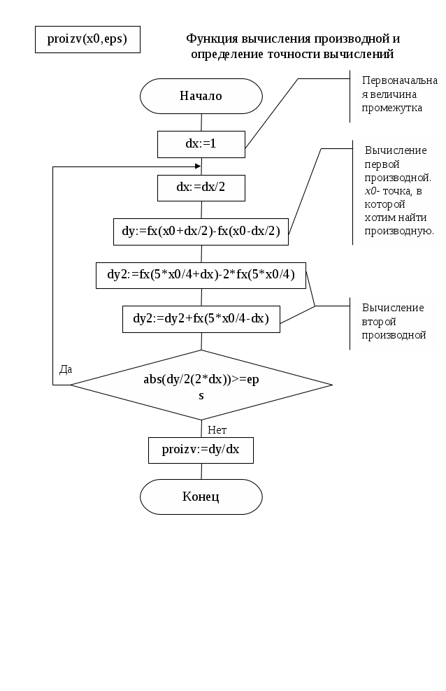 dy:=fx(x0+dx/2 -fx(x0-dx/2) – вычисление первой производной в точке x0 ,