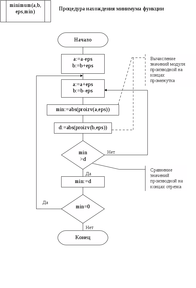 Здесь min:=abs(proizv(a,eps))- модуль значения производной функции в начале отрезка,