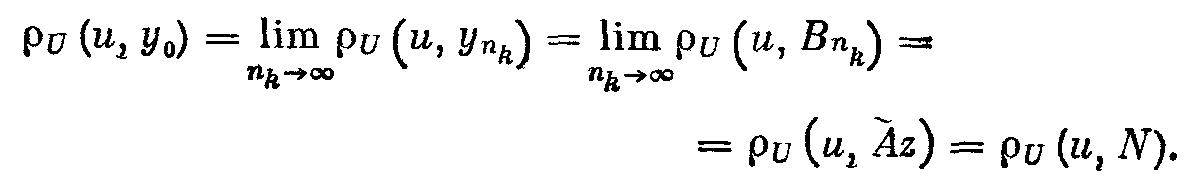 Возьмем произвольный элемент u>0> из Uo. Покажем, что функция (u) непрерывна на u>0>. Предположим, что это неверно. Тогда существует такое число >1> > 0, что для всякого > 0 найдется элемент и1 из Uo, для которого >U>(и1, и>0>) <, в то время как >F>(z1,z>0>)>=>1>. Здесь z=(u1), z>0>=(u>0>) и z1Fo, z>0>F>0>.