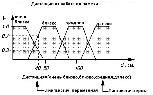 В нечеткой логике вводится понятие лингвистической переменной, значениями которой являются не числа , а слова естественного языка , называемые термами. Например, в случае управления мобильным роботом можно ввести две лингвистические переменные: ДИСТАНЦИЯ (расстояние до помехи) и НАПРАВЛЕНИЕ (угол между продольной осью робота и направлением на помеху).