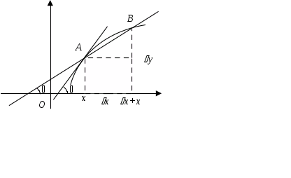 Легко заметить, что отношение равно тангенсу угла , образованного положительным направлением секущей, проходящей через точки А и В (соответствующие точкам х и х+х), с положительным направлением оси Ох, то есть, от А к В если теперь приращение х будет стремиться к нулю, точка В будет стремиться к А, то угол будет стремиться к , образованному положительным направлением касательной с положительным направлением оси Ох, а tg будет стремиться к tg .