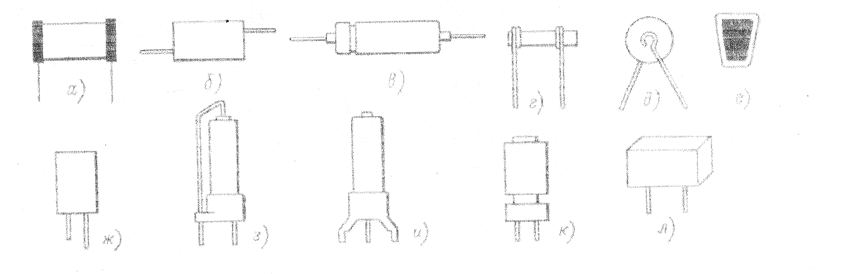 а - защищенный керамической трубкой; б - цилиндрический свободнонесущий; в - цилиндрический в стаканчике; г - трубчатый; д - пластинчатый; е - трапециевидный; ж - цилиндрический вертикальный; з - с цоколем; и - конденсатор с выводами зажимами; к - рулонный с сердечником из полиамида; л – призматический