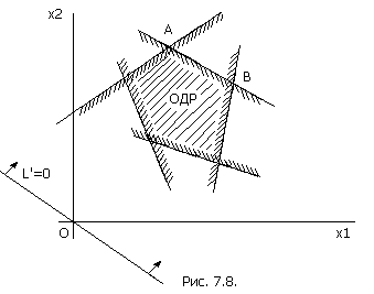 На рис. 7.6. оптимальное решение существовало и было единственным. А сейчас рассмотрим случай, когда оптимальное решение существует, но не единственно (их бесконечное множество). Это случай, когда максимум L’ достигается не в одной точке А, а на целом отрезке АВ, параллельном опорной прямой (рис. 7.8.).