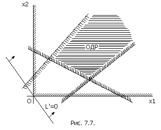 А может ли оказаться, что оптимального решения не существует? Да, может, если в ОДР функция L’ (а значит и L) не ограничена сверху. Пример такого ненормального случая показан на рис. 7.7. (в разумно поставленных задачах обычно такого недоразумения не возникает).