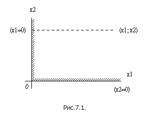 Будем изображать пару значений свободных переменных точкой с координатами x>1>, x>2> (рис. 9.1.). Так как переменные x>1>, x>2> должны быть неотрицательными, то допустимые значения свободных переменных лежат только выше оси Ox>1> (на которой x>2>=0) и правее оси Ox>2> (на которой x>1>=0). Это мы отметим штриховкой, обозначающей «допустимую» сторону каждой оси.