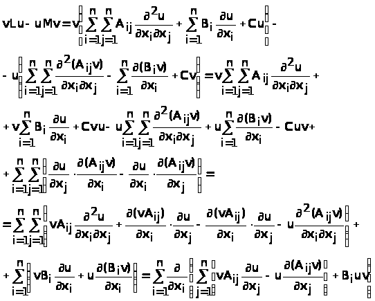 §5 торкається питання спряжених диференційних операторів. Показано, що вираз vLu – uMv, де Mv – оператор, спряжений до Lu, можна зобразити як суму частинних похідних від деякіх виразів. Отримана формула Гріна (5.2).