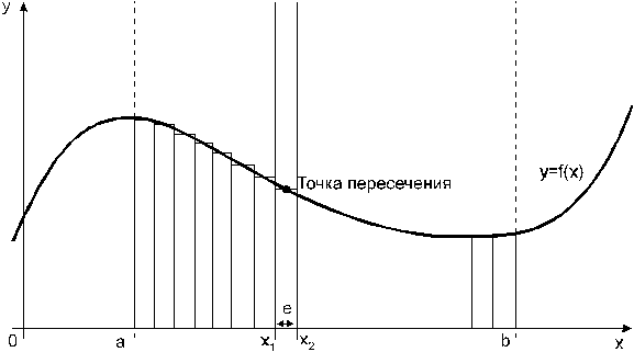По методам трапеций и средних прямоугольников соответственно интеграл равен сумме площадей прямоугольных трапеций, где основание трапеции какая-либо малая величина (точность), и сумма площадей прямоугольников, где основание прямоугольника какая-либо малая величина (точность), а высота определяется по точке пересечения верхнего основания прямоугольника, которое график функции должен пересекать в середине. Соответственно получаем формулы площадей —
