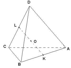 Пусть ,e>1>, e>2>, e>3>, e>4> единичные векторы, перпендикулярные граням и направленные во внeшнюю сторону. Так как площади всех граней равны, то e>1>+e>2>+e>3>+e>4> == 0 (см. задачу выше). Следовательно, 0 = | e>1>+e>2>+e>3>+e>4>|2 =4+2*(e>i>,e>j>) .Остается заметить, что скалярное произведение (e>i>,e>j>) равно —cosф>ij>, где (ф>ij> — двугранный угол между гранями с номерами i и j. Т.е. сумма косинусов двугранных углов равна 2 : -4 = -2*(cosф>ij>) => (cosф>ij>)=2