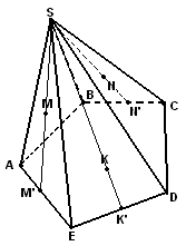 2)Проецируем каждую заданную точку на плоскость основания. Существует два возможных вида проециро-вания: центральное и параллельное. Центральное проецирование, как правило, используется при построении сечений пирамид, а вершина пирамиды, при этом является центром проекции. Параллельное проецирование используется при построении сечений призм. (в данном примере используем центральное проецирование. Опускаем из вершины S к плоскости |
