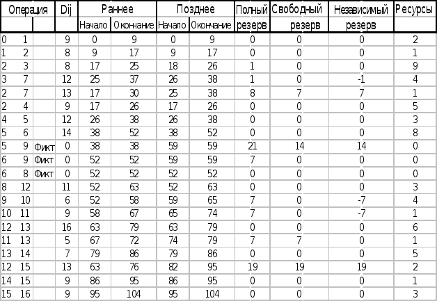 Теперь преобразуем полученную таблицу к виду (таблица 2) необходимому для построения календарного графика проекта. Введем в таблицу для каждой операции такие понятия как срок позднего начала и срок раннего окончания. Также добавим графу указывающую на потребности в ресурсах каждой операции.