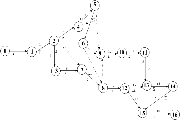На основе данных и предписаний указанных выше выполняем первый этап проекта, тоесть строим сетевой график проекта (рис 4.1). События пронумерованы в кружках, линии со стрелками - работы (далее вместо слова “ работы” я буду употреблять “операции”). Рядом со стрелками операций стоят их номера и ( с черточками над и под числом) продолжительность. Пунктиром выделены фиктивные операции.