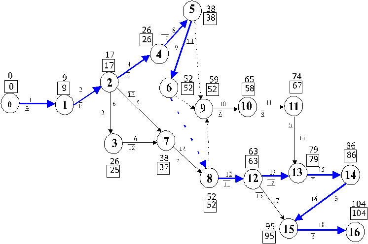 Теперь, используя результаты вычислений при прямом и обратном проходах, можно определить операции критического пути. Операция (i, j) принадлежит критическому пути, если она удовлетворяет следующим трем условиям:
