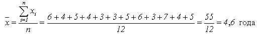 Пример. Требуется вычислить средний стаж работы 12 работников туристической фирмы. При этом известны индивидуальные значения признака (стажа) в годах: 6, 4, 5, 4, 3, 3, 5, 6, 3, 7, 4, 5.