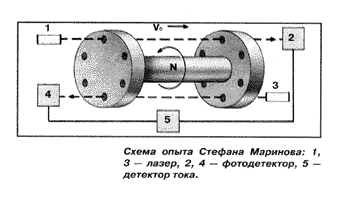 К сожалению, схема опыта (1984г.) австрийца С.Маринова (см. рис.) не удовлетворяет этим требованиям. Здесь раздвоенный лазерный луч 1,3 проходит через отверстия двух вращающихся дисков к фотодетекторам 2 и 4, которые соединены с детектором тока 5. Время срабатывания фотодетекторов, детектора тока зависит от множества помех и даже при отсутствии последних не является достаточно постоянным (сведения об их стабильности приводятся в соответствующих справочниках). Чувствительность этого прибора значительно меньше, чем интерферометра Майкельсона, изобретенного сто лет назад. Полученные данные об абсолютной скорости Земли в 300-400 км/сек, о которых говорится в статье, не согласуются с имеющимися опытными измерениями. Общеизвестно, что наша планета вращается относительно Солнца со средней скоростью около 30 км/сек. Оказывается, она еще имеет и абсолютную скорость, в десять раз большую! И куда же это ее несет? Неужто, прочь от Солнышка? Этак, пожалуй, скоро совсем замерзнем, без всякого Чубайса. А указанная там же, зависимость скорости света от направления распространения световой волны вызывает недоумение. Ведь если такая зависимость действительно установлена, то почему не опубликованы координаты этих удивительных направлений во Вселенной. В каком именно направлении скорость светового луча возрастает? В направлении на Полярную звезду, на туманность Андромеды? А в каком направлении уменьшается? Проверить это в современных астрофизических лабораториях не составит никакого труда.
