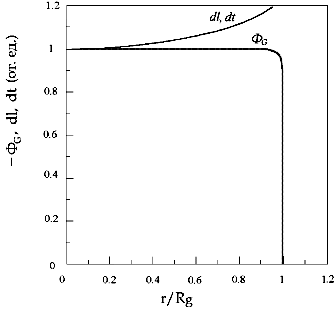 В отличие от специальной теории относительности, соотношение (8) включает в себя гравитацию. Интервал времени dt и масштаб трехмерного пространства dl связаны между собой через гравитационный потенциал, через количество гравитационно заряженного вещества в замкнутом объеме. Из рисунка 1 видно, что при равномерном распространении вещества масштаб континуума непрерывно изменяется от центра к периферии. Во внутреннем объеме всегда существует градиент вдоль радиуса, обусловливающий постоянство скорости света и гравитационного потенциала в любой точке пространства-времени. При перераспределении плотности зарядов в какой-либо области внутреннего объема меньше Rg , изменяется пространственный и временной интервалы.