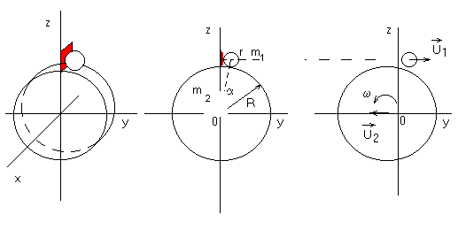 К цилиндру с радиусом основания R и массой m прикреплена жесткая невесомая платформа (центр шарика и центр цилиндра находятся в плоскости zy), на которой находится шарик, радиус которого r и масса m. После взрыва (тонкий красный слой) часть энергии перешла в кинетическую энергию цилиндра и шара E.