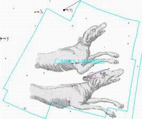 Прежде всего, альфа Гончих Псов - одна из красивейших двойных звезд. Главная звезда - горячий голубой гигант 2,9m на расстоянии около 20" имеет желтоватый спутник 5,4m. Каждая из этих звезд в свою очередь спектрально-двойная с периодом в несколько дней. Но самое любопытное, что альфа Гончих Псов - магнитно-переменная звезда.
