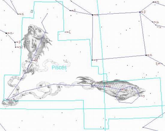 Главная звезда альфа этого созвездия одновременно и его главная достопримечательность. В бинокль хорошо видно, что а Рыб - голубая горячая звезда с температурой поверхности около 10000 К. Ее блеск 4,3m. На расстоянии 2,65" от главной звезды есть спутник - такая же горячая. Разделить эту пару в большой школьный рефрактор трудно, но при благоприятных условиях наблюдение все же возможно.