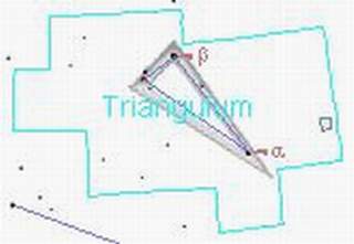 В этом маленьком созвездии, насчитывающем всего 15 видимых невооруженным глазом звезд, видна одна из самых близких к нам и наиболее изученных галактик (МЗЗ). Искать ее нужно правее альфа Треугольника в направлении почти к бета Андромеды - звезде Мирах. Предупреждаем, что галактику М 33 увидеть нелегко. Хотя после туманности Андромеды это самая яркая галактика, ее суммарный "интегральный" блеск равен блеску звезды 6,2m, поверхностная яркость М 33 мала и наблюдать ее стоит только в самые темные звездные ночи. В школьный телескоп вы увидите маленькое круглое светящееся пятнышко. Запомните, что в этот момент ваш глаз воспринял свет, посланный этой далекой (хотя и соседней) звездной системой 2 300 000 лет назад!