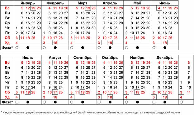 Нельзя не признать огромного влияния Луны на множество происходящих процессов на Земле, особенно связанных с жизнедеятельностью растений и животных. Влияние Луны особенно бывает сильно в Полнолуния и Новолуния. Также и Первая, и Последняя четверти, как правило, не проходят незамеченными для земной флоры и фауны. Давно замечено, например, что в Полнолуния психическая составляющая человека наиболее уязвима. Человек Разумный это заметил очень давно и старался применить это знание в устройстве своей жизни в ритме фаз Луны, сообразуя с ними свою деятельность. В идеале это давало бы очень большое удобство как психологического так и практического плана. Ведь если бы каждый календарный месяц начинался с Новолуния, а каждая новая неделя начиналась (или заканчивалась) одной из фаз Луны, то каждый бы знал, когда нужно сеять, когда – жать, а когда и отдыхать. Это бы стало частью человеческой культуры. Если Вы прочтёте замечательную книгу И.А.Климишина «Календарь и хронология» , вы узнаете, что из-за присущей Луне неравномерности движения (в проекции на Земного наблюдателя), все попытки сгармонизировать Лунный и Солнечный циклы в едином календаре после многочисленных попыток привели лишь к тому, что одна двенадцатая часть года оказалась названа в честь Луны месяцем, а его (месяца) примерно четвёртая часть выделена как неделя, согласно (опять же примерно) фазам Луны. Приемлемый по качеству Лунно-Солнечный календарь, сочетающий в себе незыблемость солнечного года с полезностью разбивки года на месяцы и недели до настоящего времени создан так и не был. Более того, работы над его созданием уже давно прекращены как бесперспективные. Однако, как вы увидите далее, при некоторых условиях, привнесённых современной цивилизацией совсем недавно, идея использования Лунно-Солнечного календаря уже не кажется столь безумной, как это могло быть ранее. Расчёт Календаря достаточно прост. Основная идея его состоит в том, чтобы разделить учёт солнечных дней и Лунных фаз. Фазы Луны будут учитываться неделями (новыми, составляющими одну четверть от синодического Лунного месяца) с максимально возможной для Календаря точностью. Каждая неделя заканчивается (или начинается, в случае использования европейского порядка дней недели) какой-либо фазой Луны, попадающей на «красные» дни, которые, как наиболее напряжённые, могли бы рекомендоваться как выходные. Главное при рассмотрении расчёта – не путать дни солнечные (равные суткам), определяющие непосредственное течение времени, и дни лунные, в нашем случае определяющие дни недели как фазы лунного месяца.