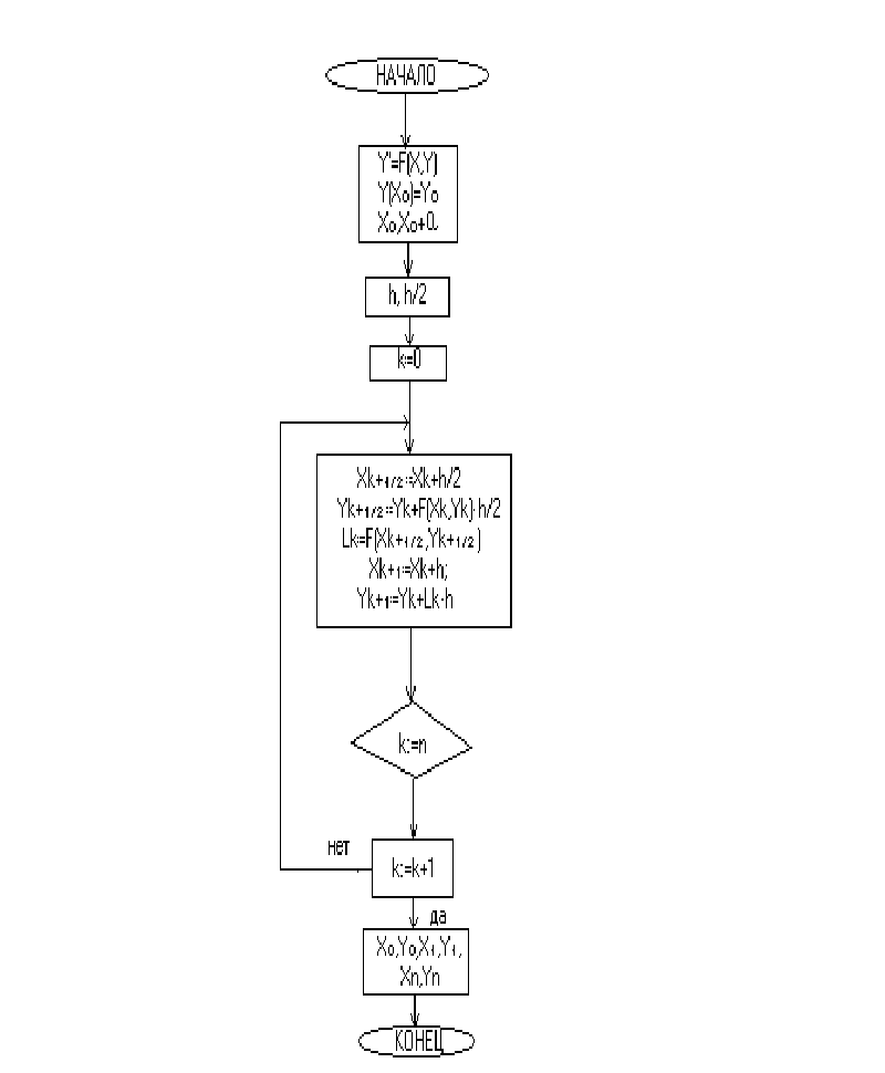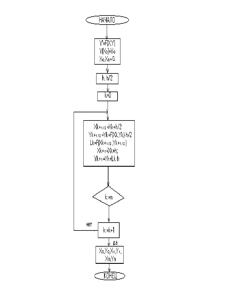 Сначала вычисляют вспомогательные значения искомой функции у>к+1>>/>>2> в точках х>к+1>>/2>, затем находят значение правой части уравнения (1) в средней точке y/>k>>+1>>/2>=f(x>k+1/2>, y>k+1/2>) и определяют у>к+1>.
