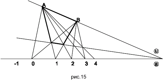 Установим соответствие между прямыми пучка, проходящего через А и точками на прямой а. Например, лучу m соответствует точка M. Очевидно, что какую бы точку на прямой a мы ни выбрали, ей всегда соответствует определенный луч. Однако, нельзя утверждать, что любому лучу соответствует точка прямой a. Действительно, возьмем луч a/ , соответствующей точки на a мы не найдем. Таким образом, соответствие между лучами пучка и точками прямой a не является взаимно однозначными. Это не всегда удобно при операциях проектирования. Чтобы устранить это неудобно, условимся считать параллельные прямые, пересекающими на бесконечности. Тогда луч а/ из пучка А, параллельный а, будет иметь на этой прямой соответствующую точку ,но не обычную ,а называемую бесконечно удаленной точкой. Это новый геометрический объект. Все параллельные друг другу прямые в плоскости a имеют одну общую бесконечно удаленную точку, поэтому систему параллельных прямых называют пучком с бесконечно удаленным центром (рис.3).